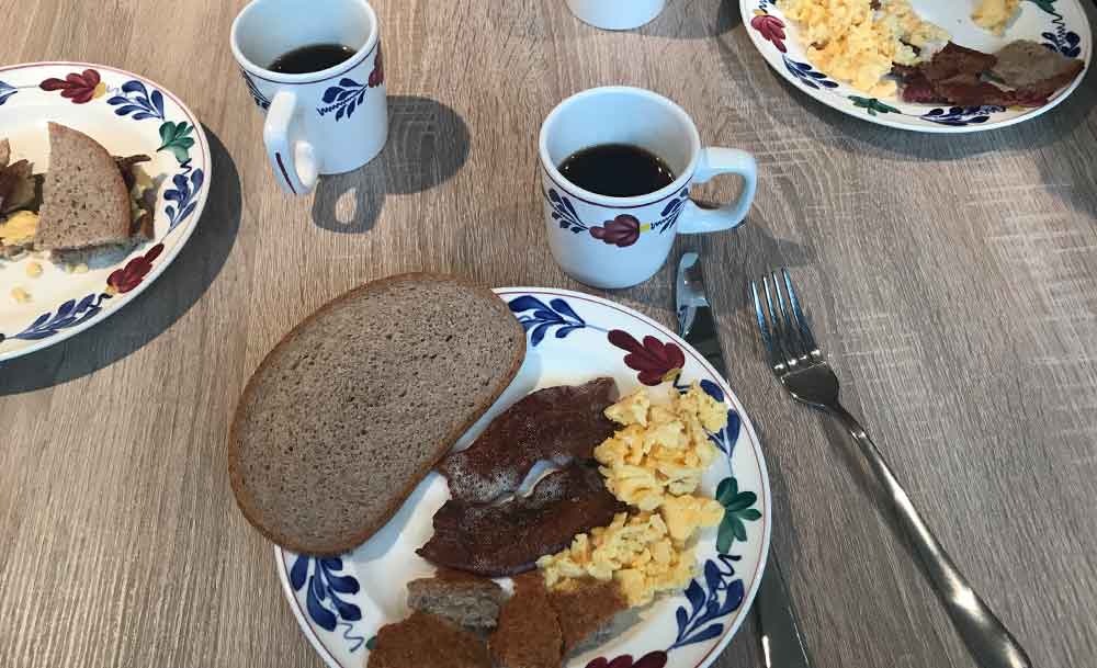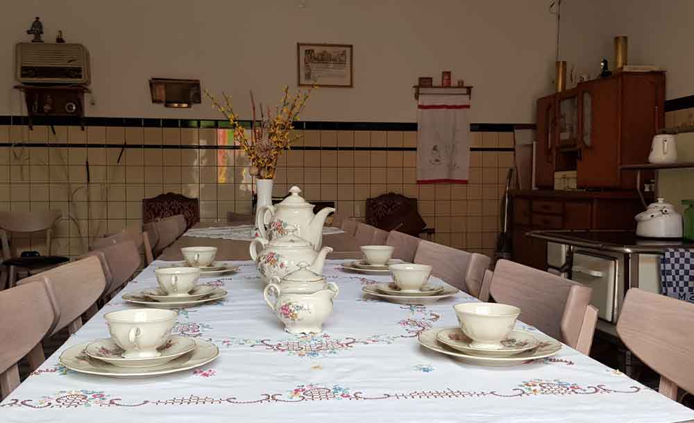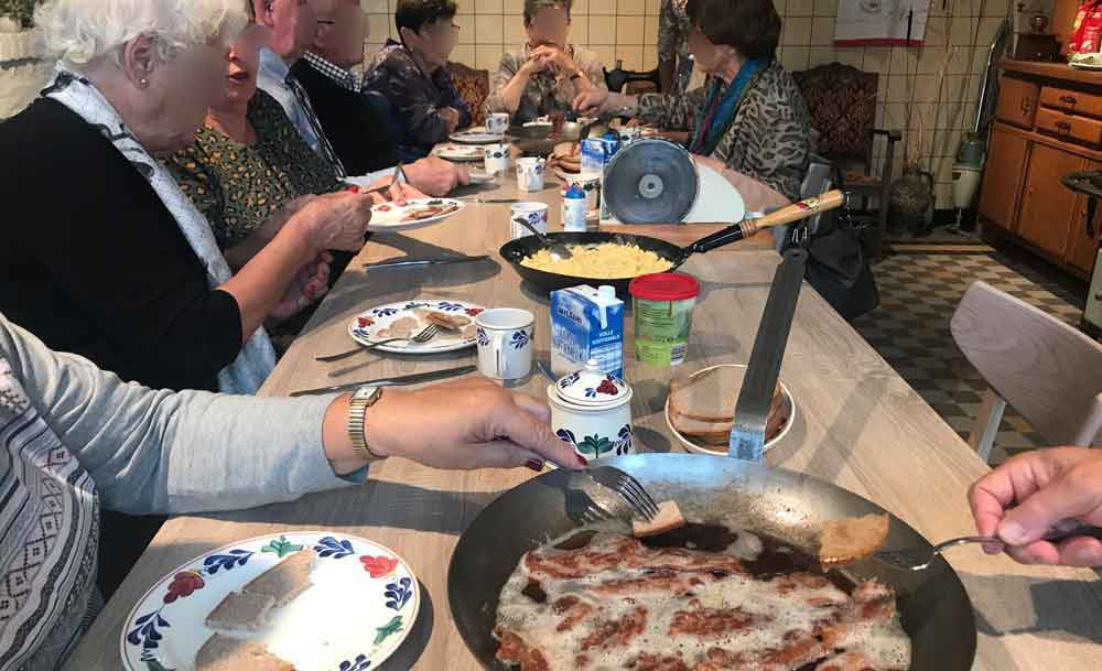 Voor het merendeel alleenstaande ouderen genieten in het Historiehuis van de Maasvallei van een ouderwetse lunch: zwartbrood met spek en ei, uit de pan op tafel. Erbij een stevige "tas koffie... mit kans op grozele".