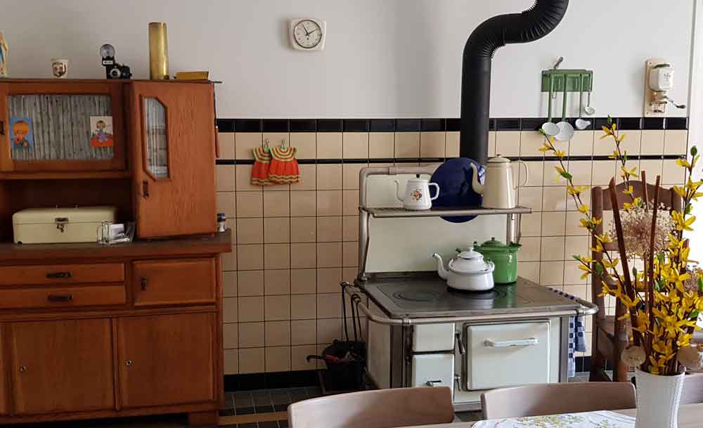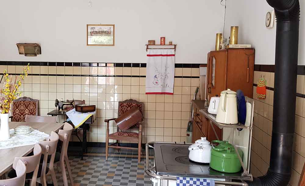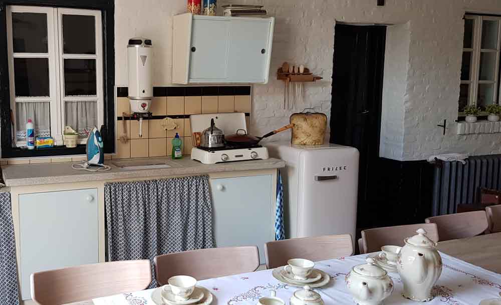 In een keuken anno 1950 een ouderwetse lunch bereiden en gezellig samen eten aan een nostalgisch gedekte tafel.